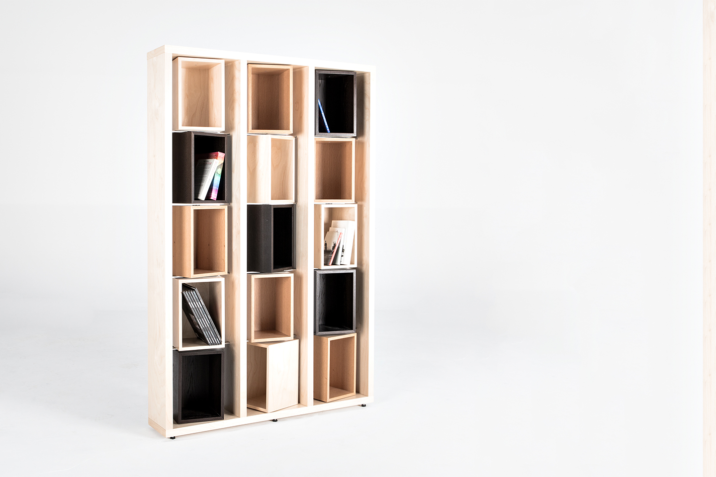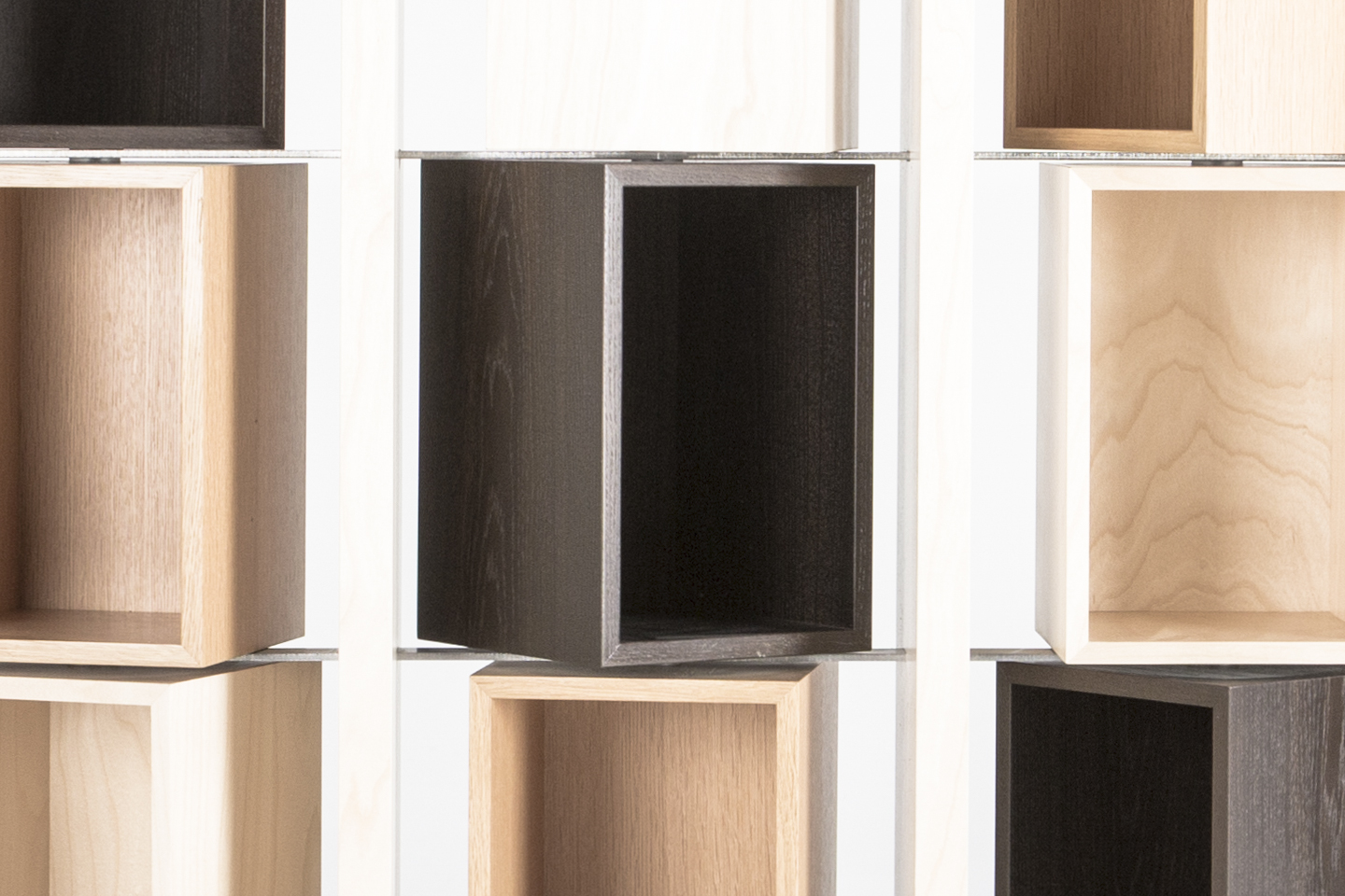 L’emploi de 3 essences de bois (chêne, bouleau, chêne fumé), et de 3 coloris de laque (blanc, gris, noir), offre de multiples combinaisons pour la configurer visuellement.