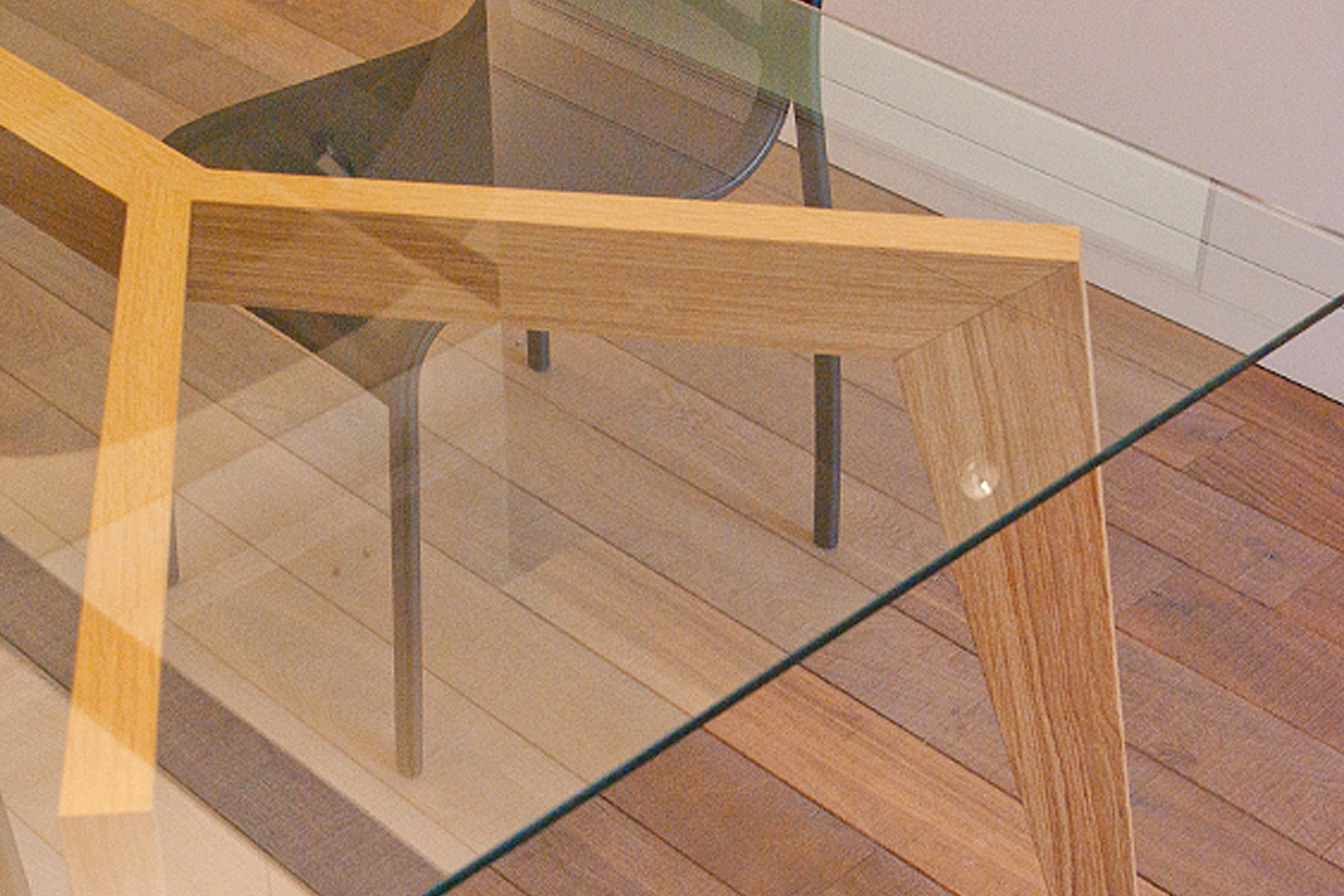 Toute la structure dynamique du piètement est mise en valeur par la transparence du verre, et apporte à cette table la simplicité et la pureté.